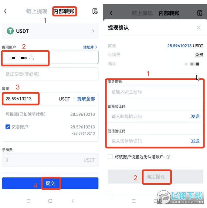 2.内部转账:打开欧易APP,选择【资产】栏 —【提现】—选择币种【USDT】—选择【内部转账】—输入【提现账户】—【数量】—【提交】—按要求获取并输入相关密码/验证码—【确定提现】,完成操作。