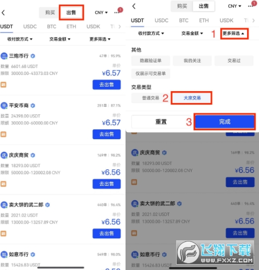 温馨提示:除【快捷买币】区进行卖币之外,您也可以选择【C2C买币】区进行交易—【出售】选择商家,以及合适的价格。如果交易金额≥10万元,也可在【更多筛选】里选择【大宗交易】。