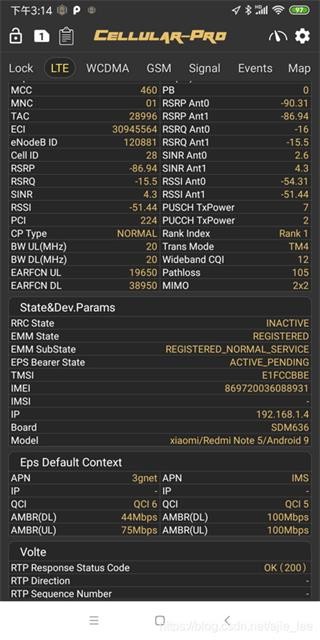 LTE视图显示当前物理层,RRC层的部分参数,常用的有小区(ECI),带宽,频点,信号(RSRP),干扰(SINR),调制方式,传输模式,循环前缀(CP)等重要信息