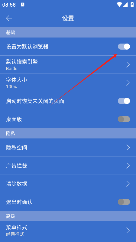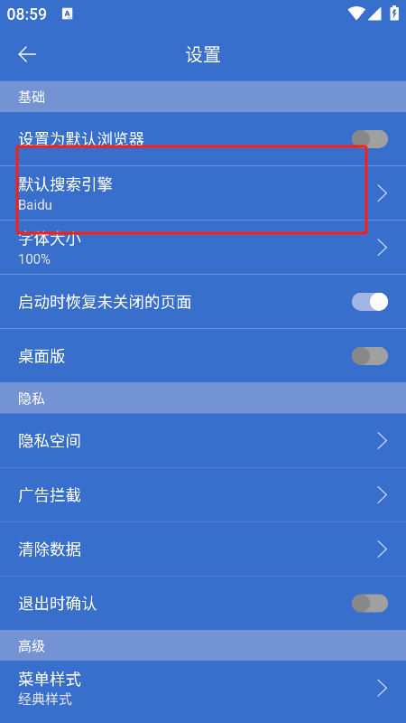 4.在设置界面,你能将软件设置成默认浏览还可以切换搜索引擎。
