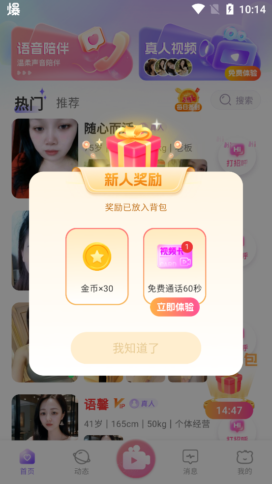 常相遇是一款真实又靠谱的陌生人面对面快速聊天交友软件,集聊天、交友、找对象、约会、恋爱为一体的社交交友约会平台。相遇可以文字互动交友,约见喜欢的她。同时也可以在线语音视频聊天交友。好玩又有趣的陌生人语音视频聊天交友软件,3秒钟注册,1分钟聊天交友,来相遇,同城单身妹子约你甜心视频聊天,真实的视频聊天交友约会脱单APP!
