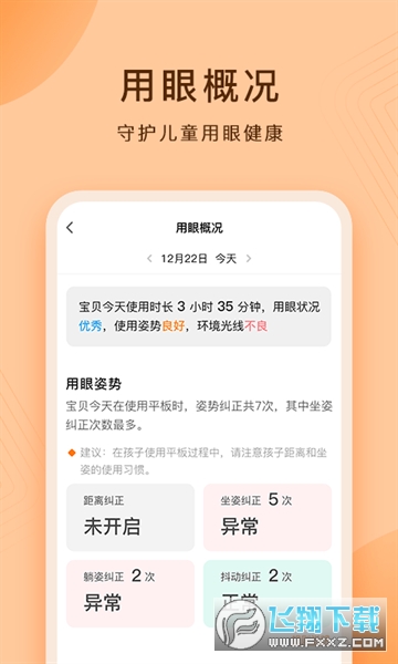 家长可以在护眼平板APP上了解孩子使用平板时的用眼习惯、姿势和环境光线。