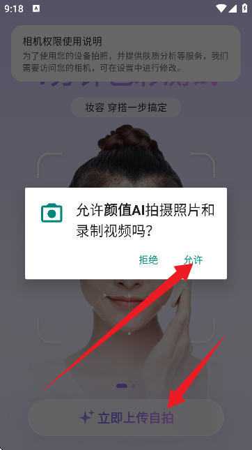 3、进入软件主界面后,点击"立即上传自拍"按钮,按要求开启相关权限