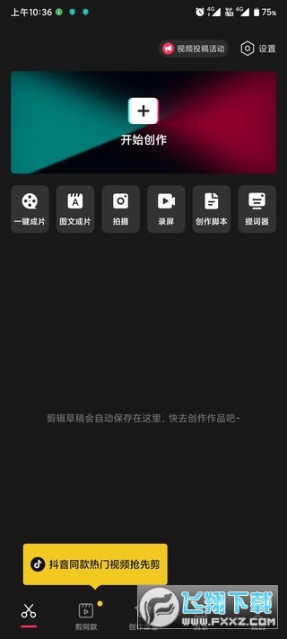 1、想要添加转场效果时打开剪映首页,然后点击“开始创作”