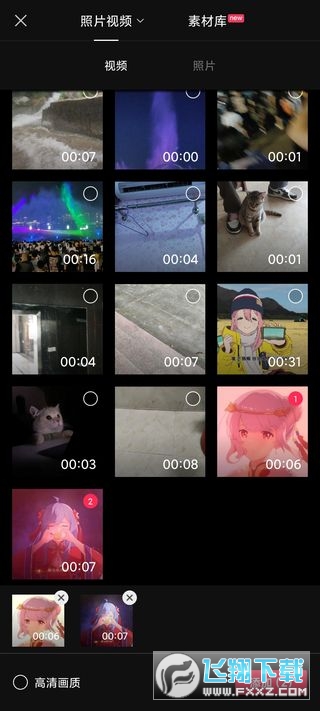 2、打开照片视频界面或者素材库,勾选至少两段视频作品,然后点击“添加”
